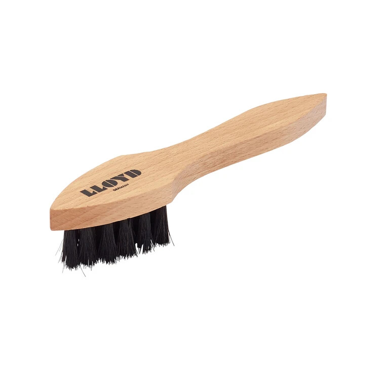 Questa spazzola per scarpe in crine di cavallo con manico in legno è ideale per applicare prodotti per la cura delle tue scarpe LLOYD.