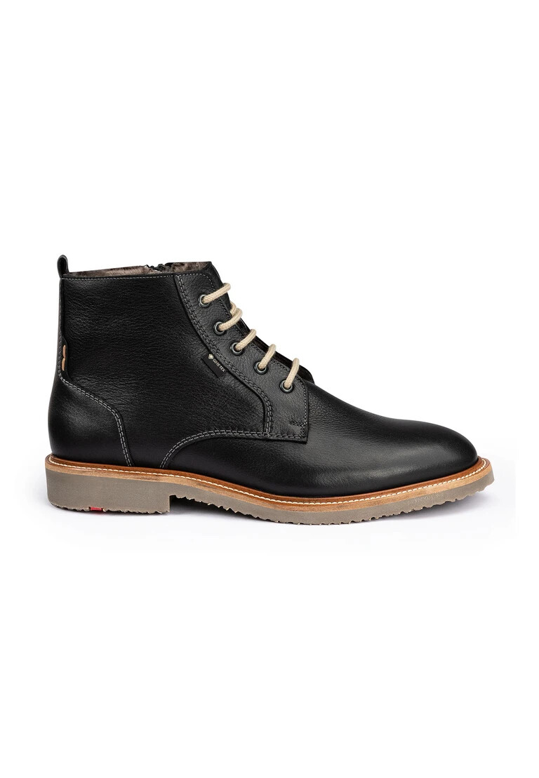 Lo stivale LLOYD in pelle nera convince grazie alla membrana GORE-TEX, impermeabile e traspirante in qualsiasi condizione atmosferica. Grazie all’allacciatura, le scarpe stringate garantiscono una calzata sicura. La suola in gomma resistente all’abrasione offre un’ammortizzazione ideale durante la camminata, mentre la soletta in pelle di agnello offre un interno caldo. Grazie al tacco piatto, lo stivale offre una presa sicura per l’uso quotidiano. La cerniera e la resistente pelle goffrata garantiscono un look personalizzato e di alta qualità e una facile chiusura. Anche nelle giornate più fredde, gli stivali stringati mantengono al caldo e regolano la temperatura grazie alla fodera in pelle di agnello.